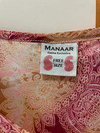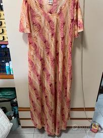 Elegante abito lungo con stampa colore salmone con delle sfumature colore oro , scollo rotondo e mezza manica ampia a campana , tessuto e modello scivoloso , il davanti e il dietro scendono piu lunghi rispetto i due lati , indossato è proprio una favola , taglia unica, è come nuovo indossato una sola volta , euro 10