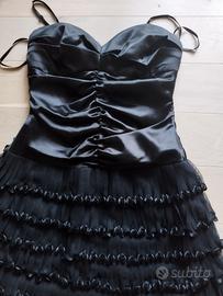 Abito corto nero Camillaconte con corpetto in raso lucido, arricciato centralmente, spalline sottili regolabili e scollo a cuore. La gonna è a balze orizzontali in tessuto plissettato con dettagli arricciati lucidi, che creano un effetto voluminoso e dinamico. Ottime condizioni, usato solo 2 volta. Taglia M Costo 20 euro
