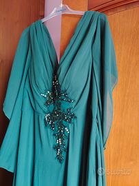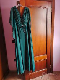 vendesi abito elegante da sera o da cerimonia verde con ricami centrali maniche di voile morbide a cascata usato una sola sola per un matrimonio. senza difetti taglia 50 comodo com un po' di elastico dietro.