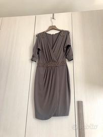 Bellissimo vestito marca originale ELISA LANDRI di VIA CONDOTTI. Modello a portafogli con spalle scoperte e piccole borchie dorate che lo impreziosiscono e lo rendono più elegante. Colore Tortora. Usato pochissimo. Perfetto. Taglia S