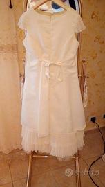 usato per comunione buonissime condizioni tag. 12/14 colore écru.. completo di coprispalla/ stola da appuntare con 1 spilletta a forma di rosa / scarpe mis. 37 + calze collant panna in busta ....il vestito arriva circa a mezzo polpaccio .. non tratt.