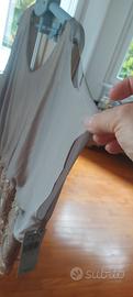 Completamente foderato, la parte sopra è di color oro beje con maniche a pipistrello, la gonna è in pizzo color oro