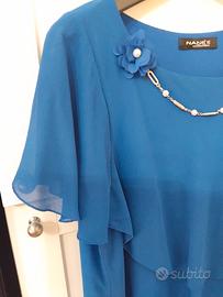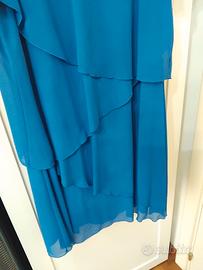 in tessuto leggero,a balze multistrato sfalsate. foderato in elastan,per una maggiore vestibilità. le maniche restano trasparenti.decorato vicino lo scollo,con catena di strass,alternata a perle.completano il tutto