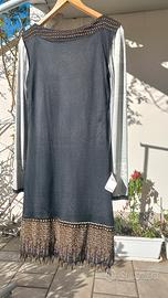 Abito originale firmato Roberto Cavalli, elegante, manica lunga, fantasia moderna, con frange terminali in cristalli di vetro.
