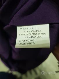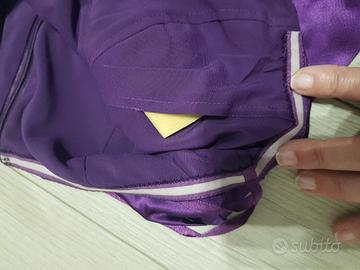Mai indossato, color viola lucido. Con scollo senza spallina, piccola imbottitura, con fodera e zip dietro come chiusura.