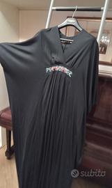 Abito elegante tipo kaftano prodotto dalla sartoria Roslein(Firenze) in viscosa nera marcato taglia 42 ma veste fino ad una 50 ed oltre. Maniche a pipistrello, scollatura a V , una decorazione con passamaneria sotto il seno che si lega sulla schiena con cintura interna e sottolinea il décolleté. Lunghezza totale dalla spalla all'orlo cm.150. La linea molto ampia e morbida lo rende adatto ad ogni tipo di figura.