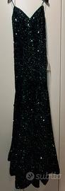 colore verde smeraldo in paillettes, modello lungo a sirena con coda,spalline sottili applicabili.