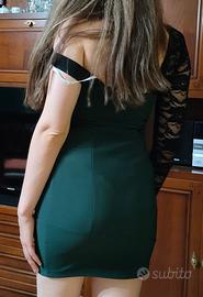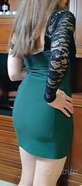 Seduzione e classe in un solo vestito! Mini abito verde smeraldo con elegante dettaglio in pizzo nero sulla manica lunga e scollo asimmetrico. Perfetto per una serata speciale o un’occasione importante. Vestibilità aderente che valorizza la figura. Indossato solo una volta, in ottime condizioni!