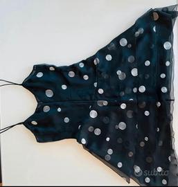 Abito corto elegante,nero a pois bianchi e grigio chiaro con spalline sottili e balze, altezza ginocchio. Taglia M, indossato una volta in occasione di cerimonia e lavato da lavanderia (vedere foto con targhetta lavaggio). Larghezza ascella 40 cm, altezza cm 80. Chiusura sul retro con zip. #madeinitaly #italianquality