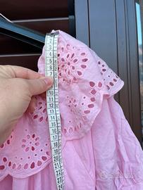 Abito estivo con elastico in vita e sulle spalle. Ampio volant traforato forma il collo e coprispalle, puro cotone molto morbido, foderato il sottogonna con tessuto 100/100 cotone. Mezza manica taglia UNICA lunghezza dalla soalla al findo cm120