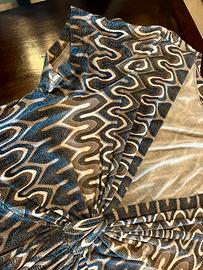 Abito estivo da donna, taglia M, elasticizzato. Manica corta, gonna fino al ginocchio. La fantasia è sui toni del grigio e ricorda quella di Missoni.
