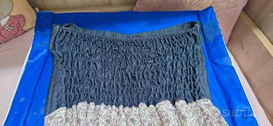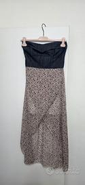 Abito estivo dallo stile boho–romantico, caratterizzato da un elegante contrasto di materiali e da una linea femminile che valorizza la figura. Il corpino è realizzato in denim scuro, strutturato e resistente, con taglio aderente che sostiene e definisce il busto. Il retro del corpetto ha un arricciatura fitta che permette al corpino di adattarsi perfettamente alla forma del busto, offrendo sostegno e una vestibilità comoda senza rigidità. La parte inferiore è in tessuto leggero e fluido, decorato da una stampa floreale delicata nei toni del lilla, rosa e verde su fondo chiaro. La gonna presenta una costruzione a pannelli sovrapposti, con movimento naturale e un effetto leggermente svasato. L’orlo è asimmetrico, più corto sul davanti e più lungo ai lati, creando un dinamismo elegante durante il passo. Il tessuto è morbido, leggermente trasparente in controluce, perfetto per la stagione calda. Il design senza spalline mette in risalto spalle e décolleté, rendendolo ideale per occasioni estive, aperitivi, vacanze o eventi all’aperto. Il mix tra denim e fantasia floreale dona un look fresco, moderno e molto femminile. Misure (visibili anche in foto) - Punto vita da lato a lato 32 (girovita 64) considerate che avendo un corpetto arricciato puo essere esteso di ulteriori cm - Parte alta del corpetto 34,5 cm (circonferenza 69) anche qui considerata la possibile maggiore estensione data dall'arricciatura sul retro. All'interno del vestito non c'è una etichetta specifica per la taglia quindi sebbene risulti una taglia unica fate fede alle misure prese al centimetro € 22 Ritiro in zona tiburtina e piu precisamente in vita tancredi cartella,altrimenti spedizione tramite il servizio che il sito stesso mette a disposizione