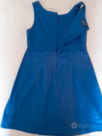 Vendo abito estivo da donna, azzurro, taglia 44 marca Rinascimento, 97% cotone 3%elastam. Usato solo in una occasione il vestito è perfetto e igienizzato. L'abito è smanicato, ha la cerniera che si apre sulla schiena e una piega baciata sul davanti. È guarnita di fiocco dello stesso tessuto sulla fascia che segna la vita un poco alta (cioè circonda il punto tra la vita e il seno), ha il corpetto rinforzato con lo stesso tessuto (vedi foto numero 6). Misura cm 87 di lunghezza dalla spallina all'orlo, cm 86 circonferenza seno, cm 80 la circonferenza della fascia col fiocco.