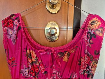Abito estivo fantasia su base fuxia, scollato con piccola apertura sul davanti chiusa con un fiocchetto sempre fuxia. E' presente un carrè alto. Tessuto leggero viscosa 96% e elastam 4%. Taglia S.