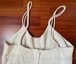 Abito estivo ecrù in cotone biologico, tessuto leggero e fresco, mercato equosolidale, chiusura posteriore con zip e spalline in cordino, utilizzato pochissimo ed in stato più che ottimo, capo originale Taglia M Verificate le misure: Da ascella ad ascella cm.40 Sottoseno ccm.38 Da ascella a fondo cm.65 Vita cm.38 Ampiezza massima fondo cm.58 Capo lavato ed igienizzato