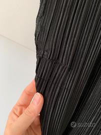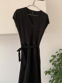Vestito nero elegante lungo a costine con spacco laterale e laccio da annodare in vita. Scollo a V. Molto comodo. Lunghezza fino a metà polpaccio circa. È stato ricucito in qualche punto ma si nota poco.