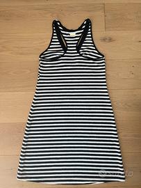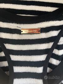 Abito estivo Twinset a righe bianche e nere. Modello con scollo a V e dettaglio a cuore rosso sul fondo. - Fantasia a righe orizzontali - Scollo a V sul davanti e all’americana dietro - Dettaglio cuore ricamato - Targhetta in metallo con marca sul retro