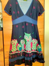 Il vestito è a mezza manica e si adatta all'inverno con una dolcevita e alla mezza stagione con una camicetta. La taglia è unica e direi che corrisponde a una M. Molto graziosi i gufetti stampati sia davanti che dietro. L'abito è in ottime condizioni e non presenta difetti.