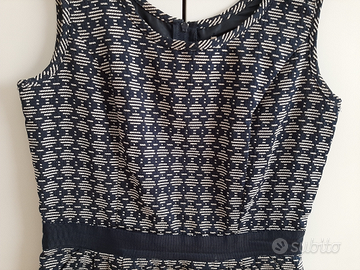 Abito fantasia bianco/blu "Camaieu", elasticizzato, stretto in vita con gonna ampia. Taglia italiana 40 (FR 36 EU 36 UK 8 RUS 42). Usato poche volte. Lunghezza a metà coscia. Chiusura con cerniera sulla schiena. Fodera interna blu scura.