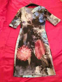 Elegante abito in tessuto elasticizzato del marchio Sandro Ferrone. Fantasia floreale, catena applicata davanti, chiusura con cerniera dietro, manica corta, taglia 40 italiana. Indossato una volta, arriva sopra il ginocchio.