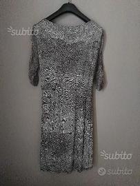 Meraviglioso abito firmato Le Fate fantasia animalier interamente foderato, scollo a V incrociato sul petto, punto vita leggermente segnato, lunghezza al ginocchio, maniche a 3/4 trasparenti, motivo di pietre e perle su una parte dello scollo, taglia 48 vestibilità da 46 a 48, usato una sola volta, elegante e fine. Valore intorno ai 150 eur