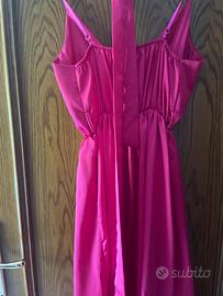 Abito fucsia con spalline sottili incrocio sul davanti possibilità di inserimento di cintura con passanti lungo alle caviglie davanti al taglio del seno non trasparente si incrocia e ha uno spacco con le Rouge usato una volta sola fatto in Italia in viscosa usato una volta si consegna la lavato e stirato