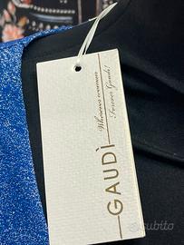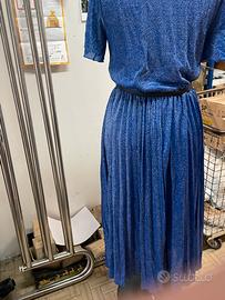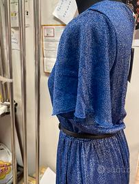 Abito nuovo Gaudi’ con cartellino Colore bluette lurex adatto anche per occasioni gonna longuette plusse Con spacco nolto profondo che fa vedere la gonna dritta piu’ corta