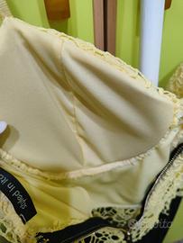 abitino estivo costituito da una parte superiore ricamata di colore giallo canarino con spalline e con coppe imbottite (la sezione sulla pancia è scoperta) e una parte inferiore formata da una gonna al ginocchio morbida di colore nero. L'abito presenta una cerniera nella parte posteriore con un piccolo bottoncino giallo all'estremità. Buona vestibilità per una taglia M