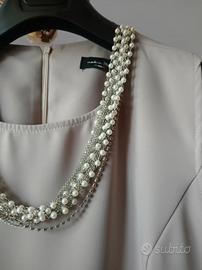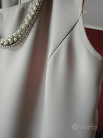 Collana in perle e strass visibile in foto cucita sull'abito.