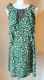 Bellissimo abito GUESS in fantasia animalier sui toni del verde, senza maniche, gioco di ruches sui due lati del davanti che dà “movimento” all’abito stesso, inserto stile “pettorina” nero, placchetta con logo del brand sul davanti, chiusura con bottoncino sul retro, taglia M (corrisponde ad una 42 italiana, 38 francese), lunghezza 92-93 cm, torace 40 cm; arricciatura con elastico in vita sul retro, mai indossato nuovo.
