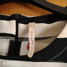 Splendido mini abito Imperial Fashion a righe bianche e nere. Modello strutturato con iconici pannelli laterali neri che creano un incredibile effetto ottico modellante e snellente sulla silhouette.