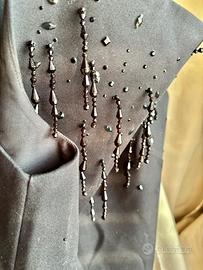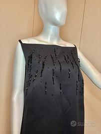Miniabito senza maniche in twill impreziosito da luminosi strass e frange sul davanti decorate di perle. Silhouette svasata, scollo quadrato. Spalline sottili e cerniera nascosta dietro. Fodera in taffetà. Taglia L Misure come da foto Nuovo