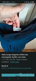 Abito elegante in chiffon blu notte MONOSPALLA. Parte superiore tutta a piccolissime pieghe plisse' monopalla con fermaglio oro. parte sotto gonna lunga morbida con sottogonna. Elegantissimo e completo di STOLA. Indossato Una volta.