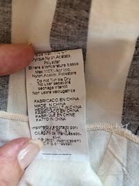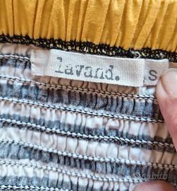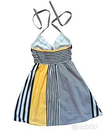 Abito estivo corto con scollo a V e allacciatura americana dietro al collo. Marca Lavand. Design moderno a blocchi di colore; strisce verticali e orizzontali nero e bianche con un pannello giallo acceso sul davanti. Taglia:S (Small). In cotone, tessuto fresco e naturale Schiena elasticizzata (punto smock) per una vestibilità aderente e confortevole. Lavaggio: In lavatrice a massimo 30°C; non usare l'asciugatrice. Lunghezza: 76 cm Misura da ascella ad ascella: 33 cm