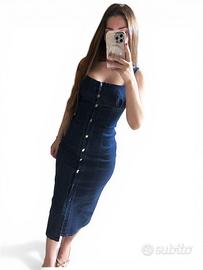 Abito in jeans dal taglio femminile e super versatile, perfetto sia per look casual che più curati. Linea aderente che valorizza la figura senza rinunciare al comfort. 🔹 Dettagli principali: * Tessuto denim elasticizzato * Spalline larghe e scollo dritto * Chiusura frontale con bottoni lungo tutta la lunghezza * Taglio aderente stile bodycon * Lunghezza midi (sotto il ginocchio) * Colore: blu denim classico 🔹 Condizioni: In ottime condizioni, indossato poche volte, nessun difetto evidente. 💡 Perfetto con sandali o tacchi per un look estivo chic, ma anche con sneakers o giacca per un outfit più casual.