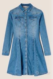 Vestito in denim di cotone stretch, lavaggio medio con sabbiature; colletto a vela e abbottonatura frontale con bottoni a vista in metallo; taglio carré sagomato, tasche frontali con patta applicate, maniche lunghe con polsino sul fondo; gonna svasata con tasche verticali.