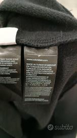 Abito nero in felpa Calvin Klein Jeans di SECONDA MANO maniche lunghe con mongramma nero CK ripetuto su sfondo bianco completo di cappuccio con coulisse. Vestibilità ampia. Tasca a marsupio. Elasticizzato sia su polsini che parte bassa.