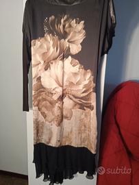 Abito longuette INTREND adatto da taglia 44 a 50, in morbida maglina. Davanti la maglina ha effetto raso semiopaco. Orlo a balze irregolari in velo.