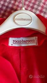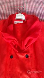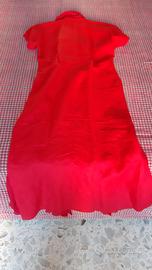 Abito rosso in lino con inserti in seta a spicchi che ampliano la larghezza della gonna. Maniche corte con spalline, sciarpa in seta che arricchisce lo scollo a punta. Bottoni a cappa neri lucidi. lunghezza midi. Rocco Barocco.