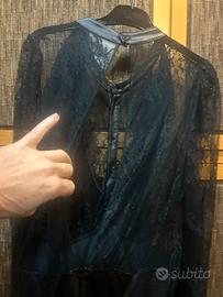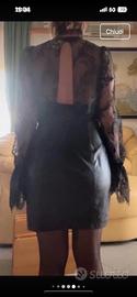 Abito in pizzo e ecopelle con schiena scoperta e maniche a volant. Usato solo una volta. Se notate delle paillettes che sono rimaste( ho cercato di toglierle tutte , ma potreste trovarne alcune, e’ solo perché nell’armadio era vicino ad un vestito con paillettes. Ma ovviamente si tolgono .Acquistato l’inverno scorso ed usato solo un paio di volte. Completa di sottanina da mettere o no. Ottimo sotto le feste.
