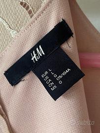 Meraviglioso, tutto in pizzo foderato di un delicato rosa cipria. Le bande elasticizzate in tessuto lungo il corpo e lungo le maniche servono per poter espandersi il giusto e seguire curve e movimenti