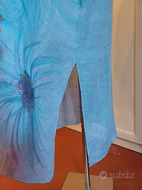 Abito in puro lino color azzurro con motivi floreali dipinti a mano. Lunghezza 100; Larghezza davanti 62