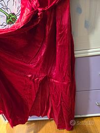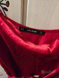 Abito in raso Zara color rosso brillante con cintura incorporata con frange sulle estremità. Scollo sul decoltè morbido e spalline sottili. Piccolo spacco sul fondo. Taglia EUR M.