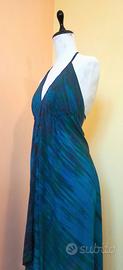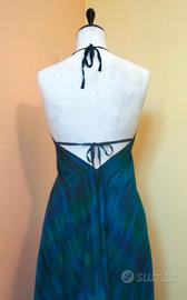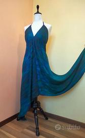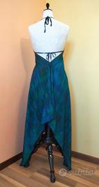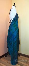 Abito in seta blu lungo, colore blu e verde melange. Modello lungo ai lati e più corto nella parte centrale.