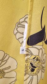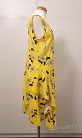 Abito in seta P.A.R.O.S.H, di colore giallo con raffinati motivi floreali neri. Vestito dalla linea svasata, pince al seno, scollatura a V sul decolté e sulla schiena, volant sul laterale destro. Si indossa semplicemente infilandolo, senza cerniere o aperture. Cuciture interne alla francese, molto accurate. Il colore del vestito è molto bello e lievemente più vivace di come appare in foto. Il tessuto è di seta, leggera, opaca e al tatto sembra vagamente increspata. Taglia S, veste 40/42. Ottime condizioni. Etichetta composizione tagliata per evitare che trasparisse. Misure vestito: Lunghezza totale: 93 cm Petto: 44,5 cm Ampiezza spalline: 8 cm