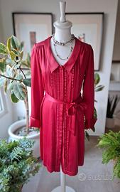 Introvabile e bellissimo abito in pura seta, disegnato da Viktor & Rolf by H&M, in un luminoso color rosso fragola, acquistato diversi anni fa a Parigi a 80 Euro, è stato usato ad un evento e poi e sempre rimasto nell'armadio. Può essere indossato come abitino, con la sua cintura coordinata, oppure molto chic, senza cintura, come tunica sopra un pantalone palazzo e la cintura, come sciarpetta. Insomma, è uno splendido capo versatile, che non passerà inosservato durante le prossime festività. Indossabile anche da una taglia M. Fare riferimento alle misure sotto riportate: