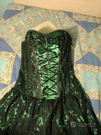 Abito in stile gotico, color verde smeraldo con pizzo nero in sovrapposizione. Gonna lunga dietro e più corta sul davanti, poco sopra il ginocchio (io sono alta 165 cm). II corsetto è sostenuto da stecche di silicone semirigide, che tengono bene la forma ma sono abbastanza morbide da non risultare scomode.
