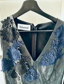 Design: Scollo a V profondo, silhouette leggermente a tubino o svasata, con ricami floreali in rilievo posizionati asimmetricamente sulla parte superiore e inferiore.