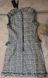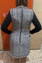 Elegante abito corto in tweed, perfetto per ogni occasione. - Design doppiopetto con bottoni dorati. - Dettagli sfrangiati su maniche e orlo. - Senza maniche.