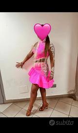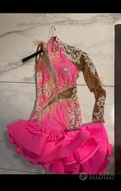 Abito latino americano colore fuxia con aplicati strass swarovski, boreali e ricami in pizzo.